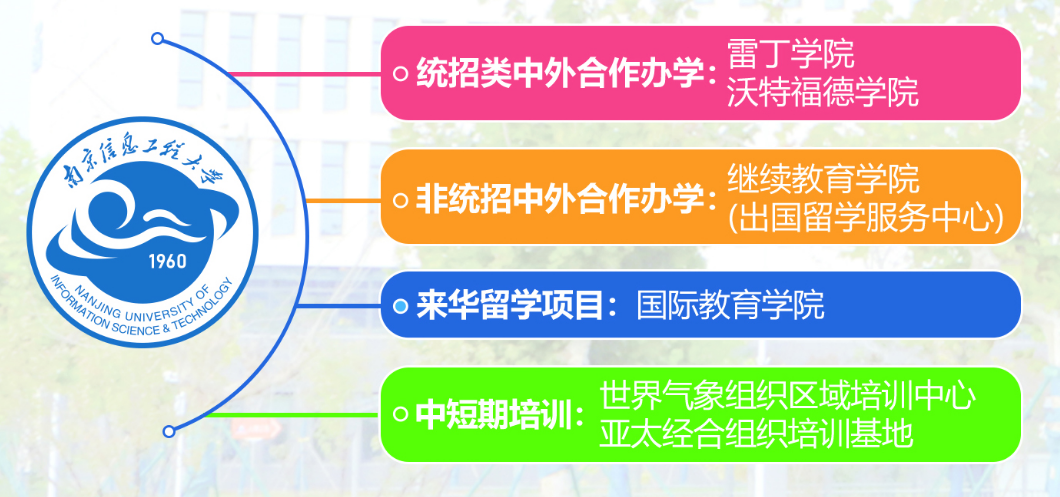 南京信息工程大学是中国(教育部)留学服务中心的战略合作伙伴,已与英国、澳大利亚、加拿大、新西兰、日本的10余所世界知名大学签署项目合作备忘录(英文简称:MOA),为学生搭建了一条权威、便捷、安全的出国留学通道。