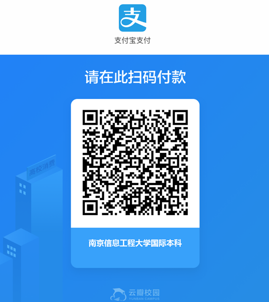 学生或家长通过扫描支付宝二维码向“南京信息工程大学国际本科”专用账户支付培养费。