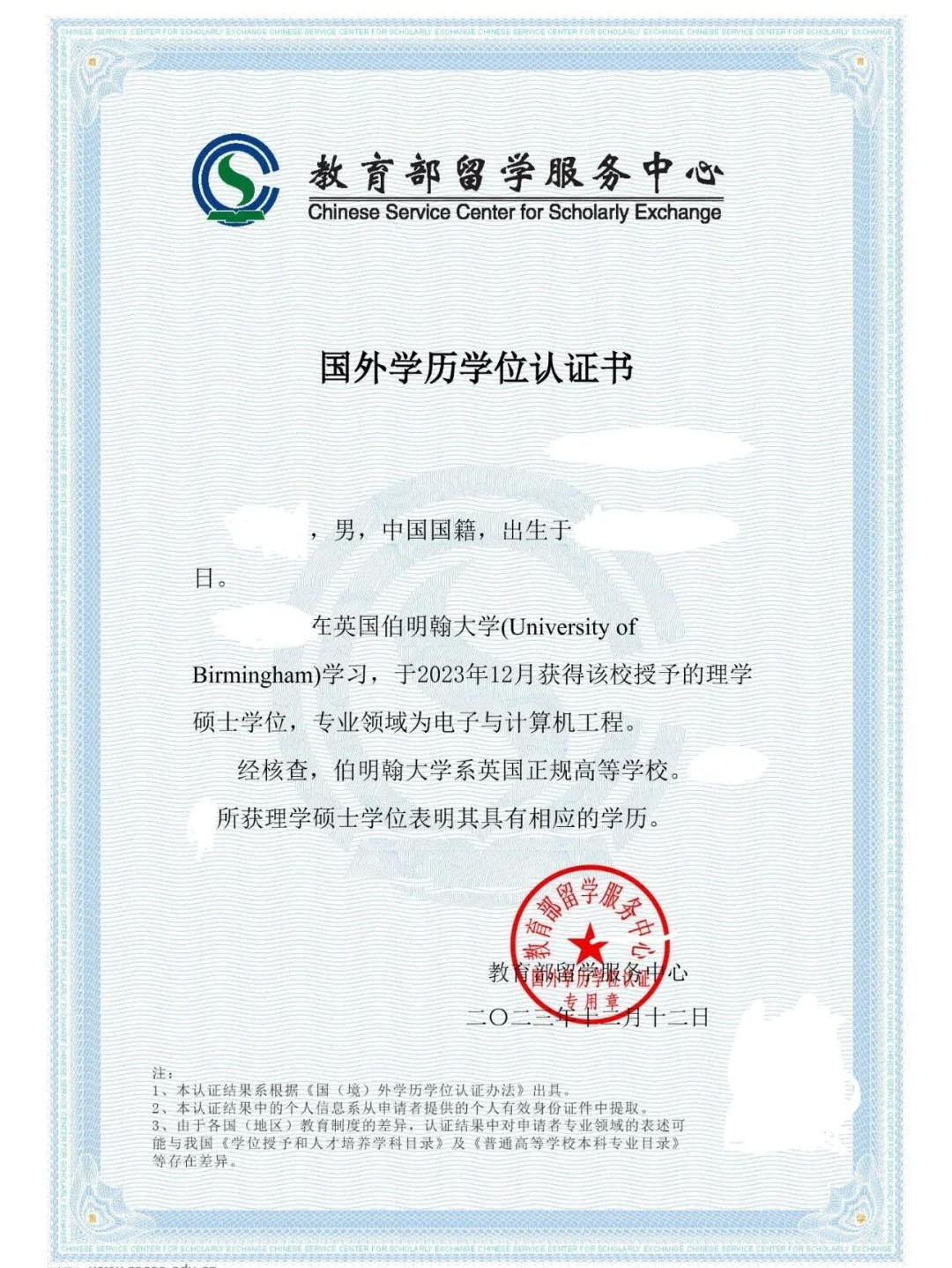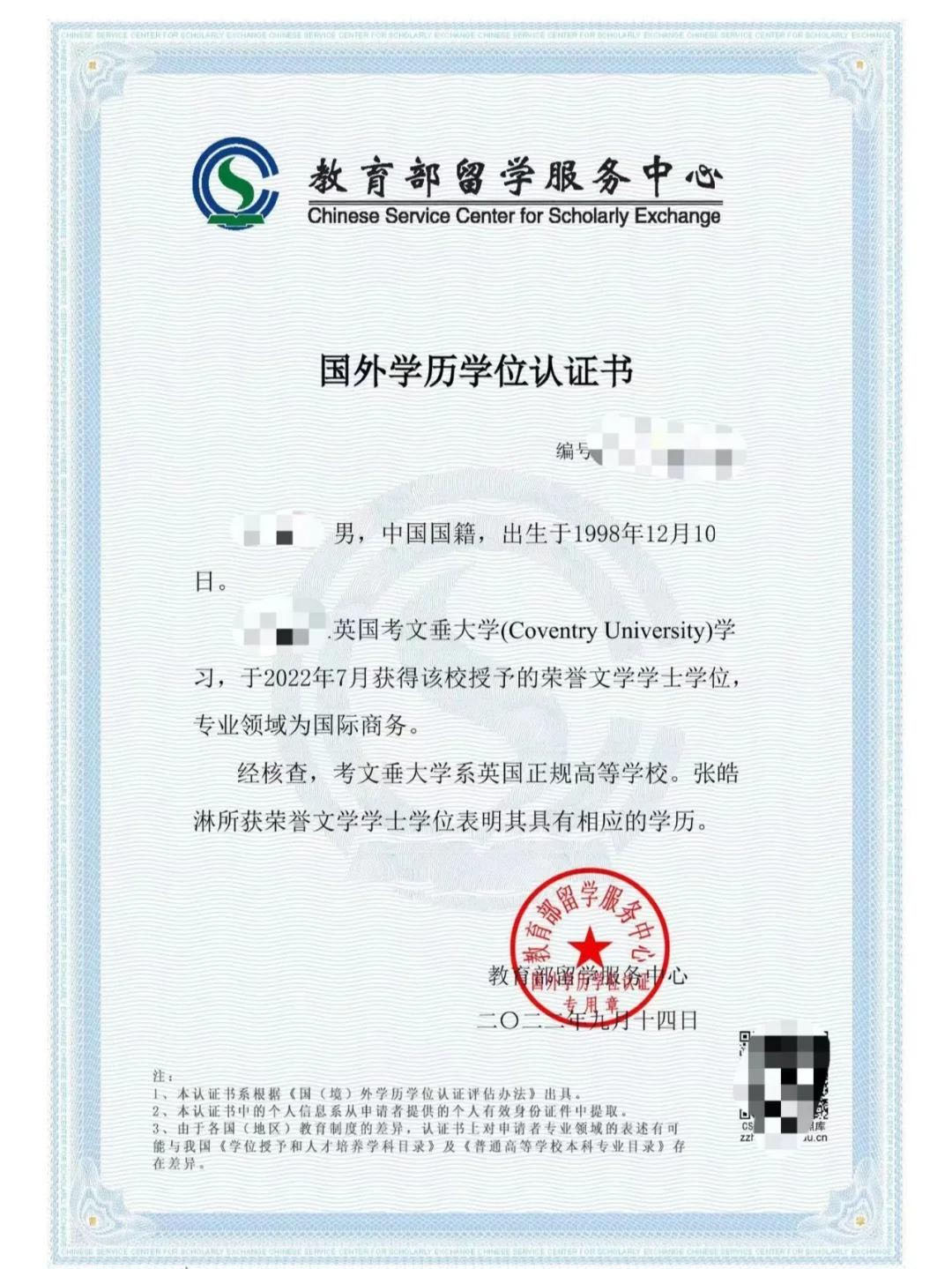 硕士学历认证样本