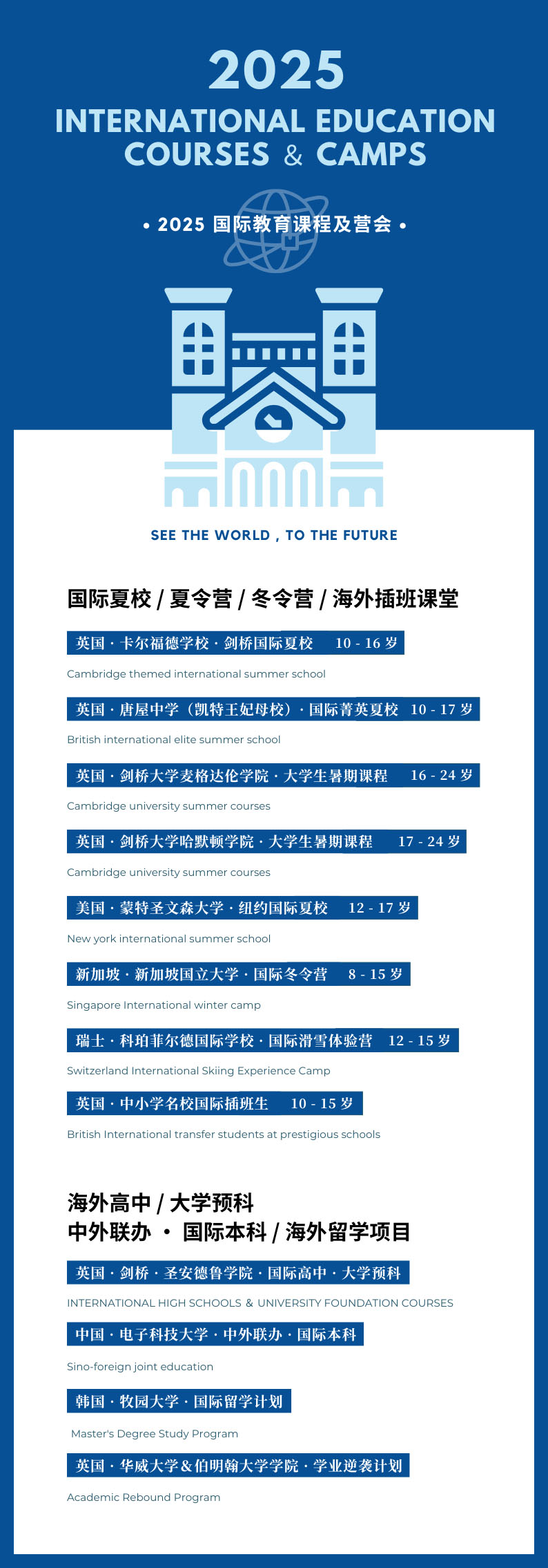 8大国际教育课程,充分调动“未来5感”,从「认知力」、「能动力」、「领导力」、「观察力」、「自我觉醒力」等未来先决优势出发,在全球挖掘优质教育课题项目资源,与你们在世界相遇。
