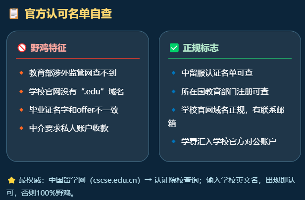 💰 收费陷阱:如果中介要求你将“保录费”“中介费”打入私人微信/个人账户,而不是对公账户,并承诺“不成功全额退款”(往往跑路),立刻拉黑!正规机构费用通过对公转账。